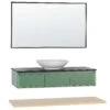 Vind een plek voor elke accessoire, cosmetica en handdoek in je badkamer met deze functionele meubelset. Bestaande uit een hoge kast, een hangende ijdelheid kast en een spiegel, maken dit tot de beste opbergoplossing voor de badkamer of wasruimte. De hang unit heeft twee verborgen kasten en zes open vakken voorzien van heldere glazenplanken die perfect zijn voor het uitstallen van bijvoorbeeld parfums of kaarsen. Daarnaast is hij voorzien van twee handdoekhouders aan de zijkant. De wastafel wordt geleverd met een keramische wasbak aan de bovenzijde die geschikt is voor gebruik met een eengreepsmengkraan. Er is ook een open plank en een ruime lade voor je haardroger of extra handdoeken. De hele set wordt gecompleteerd met een ronde LED-spiegel, bediend met een aanraakschakelaar.