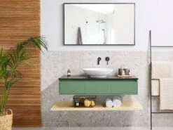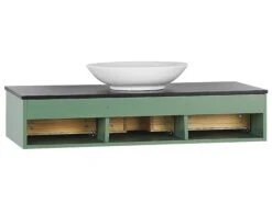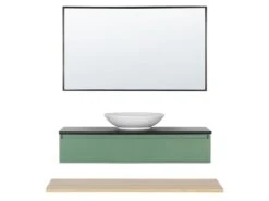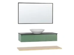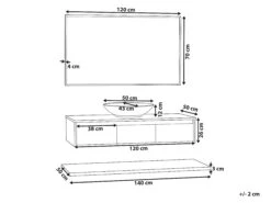 Breng functionaliteit en een elegante stijl in je badkamer met deze trendy 4-delige set. Het wordt geleverd met alle benodigde apparatuur, een wandkast met een wastafel, een hangende plank en een spiegel. Het badmeubel is voorzien van 3 softclose lades, perfect voor het opbergen van make-up accessoires of cosmetica. Hij is voorzien van een zwarte plank met daarop een ronde wastafel, ontworpen voor gebruik met een wandkraan of een kraan die aan het werkblad wordt bevestigd. Met de wandplank kun je de ruimte volledig benutten. Gebruik het om de dingen op te bergen die je bij de hand wilt hebben, zoals handdoeken of toiletpapier. De spiegel in een zwarte lijst past perfect bij de hele set en geeft hem een ​​strakke, moderne uitstraling.