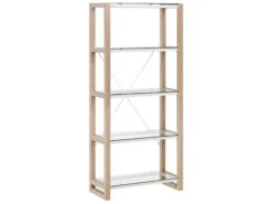 Creëer je eigen thuiskantoorhoekje met deze set stijlvolle meubels. Dit bureau is ontworpen met een breed blad met een functionele en ruime lade, geplaatst op een kriskras metalen frame. Dit stuk biedt voldoende ruimte voor een laptop, boeken, schrijfwaren of een tafellamp. De boekenkast wordt geleverd met 4 ruime glazen planken waar je niet alleen je documenten maar ook souvenirs, foto’s en andere decoratieve spullen in kwijt kunt. De set is gemaakt van bewerkt hout, dat duurzaam is en eenvoudig onderhoud vereist om vele jaren mee te gaan. Het universele kleurenschema van wit met licht hout geeft het een Scandinavisch, minimalistisch gevoel dat geweldig past bij verschillende interieurontwerpen.