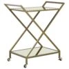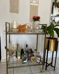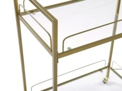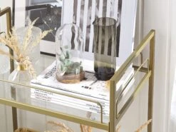 Als je op zoek bent naar multifunctionele en decoratieve serveerwagen, dan is deze trolley de perfecte keuze. Het heeft twee planken van gehard glas, die je veel ruimte bieden voor bloemstukken of kaarsen, maar ook voor schalen en pannen wanneer je eten wilt serveren. Het frame in goud met een matte afwerking zorgt niet alleen voor een elegante uitstraling, maar ook voor stabiele stand. Dankzij de vier wielen is de trolley eenvoudig te verplaatsen van de eetkamer naar de woonkamer.