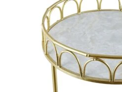 Als decoratieve bijzettafel in je woonkamer of als mini-bar in de eetkamer – deze indrukwekkende serveerwagen laat elke ruimte stralen. De versieringen in goud komen uitstekend overeen met de twee ronde planken met een marmerlook. Dankzij de vier zwenkwielen kan de trolley gemakkelijk heen en weer worden verplaatst.