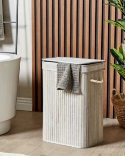 Met deze handgemaakte mand wordt het organiseren van je was uitzonderlijk eenvoudig. Het kledingstuk heeft een deksel met ritssluiting, zodat je het niet helemaal hoeft te verwijderen om je kleding op te bergen. Bovendien wordt het geleverd met een set handvatten, dus het zal niet moeilijk zijn om het te verplaatsen, zelfs met items erin. Het buitenste deel van de mand is gemaakt van natuurlijk bamboehout, terwijl het binnenste deel is bedekt met polyester.