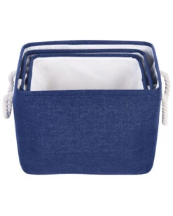 Deze set opbergmanden past dankzij het universele en eenvoudige ontwerp in elk interieur. Het is verkrijgbaar in drie verschillende maten en passen op de meest noodzakelijke kleinere of grotere spullen. Gevlochten handgrepen geven ze een maritiem karakter, waardoor ze er geweldig uitzien op open planken.