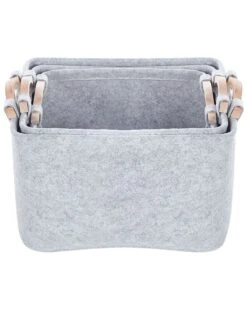 Zorg ervoor dat je woonaccessoires en spullen overzichtelijk in een kledingkast of boekenkast staan ​​met deze set van drie manden. De stukken zijn handgemaakt van hoogwaardig vilt, waardoor ze licht en zacht aanvoelen. Dankzij de houten handvaten verplaats je de manden gemakkelijk en door de drie verschillende formaten kun je ze op meerdere manieren gebruiken.