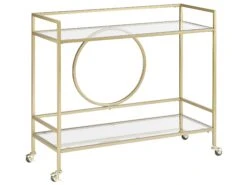 Extra decoratief en flitsend, deze glamour-barwagen zal de perfecte feestgenoot zijn. Het gouden metalen frame wordt gecombineerd met twee glazen oppervlakken, wat het stuk een elegante uitstraling geeft en tegelijkertijd praktisch in gebruik maakt. De trolley is uitgerust met vier wielen met remmen, waardoor veilig gebruik mogelijk is, zonder angst voor wegrollen.