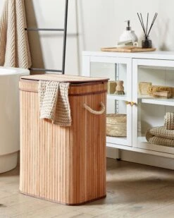 Als je genoeg hebt van willekeurig verspreide kleding in de badkamer of slaapkamer, is deze mand het perfecte accessoire voor jou. De hoge container heeft een voering met twee compartimenten voor een betere scheiding van de was en een deksel dat zorgt voor een nette uitstraling. De minimalistische stijl wordt geaccentueerd met gevlochten touwhandvatten voor gemakkelijke draagbaarheid. De natuurlijke bamboe planken waaruit de mand is gemaakt geven hem een ​​natuurlijke uitstraling, waardoor hij gemakkelijk in elke moderne ruimte past.