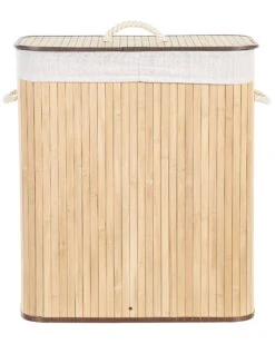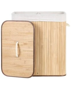 Als je genoeg hebt van willekeurig verspreide kleding in de badkamer of slaapkamer, is deze mand het perfecte accessoire voor jou. De hoge container heeft een voering met twee compartimenten voor een betere scheiding van de was en een deksel dat zorgt voor een nette uitstraling. De minimalistische stijl wordt geaccentueerd met gevlochten touwhandvatten voor gemakkelijke draagbaarheid. De natuurlijke bamboe planken waaruit de mand is gemaakt geven hem een ​​natuurlijke uitstraling, waardoor hij gemakkelijk in elke moderne ruimte past.